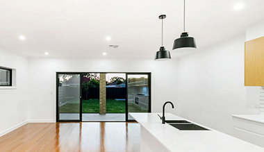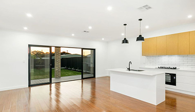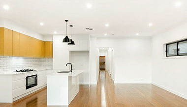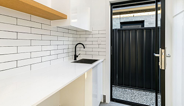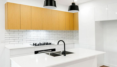 Ang estilo sa pultahan niini nga proyekto espesyal kaayo. Ang taas nga gloss white lacquer nga mga pultahan nga adunay kahoy nga grain nga melamine nga mga pultahan naghimo sa kusina nga talagsaon gikan sa regular nga mga disenyo sa kusina.