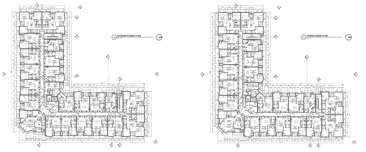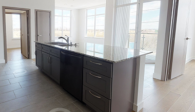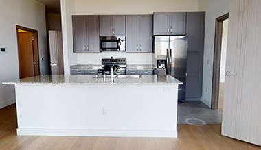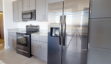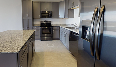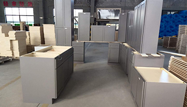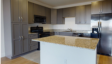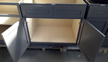 Semua dapur untuk proyek ini adalah gaya pengocok kayu solid dengan cat abu-abu dengan meja berbutir halus.