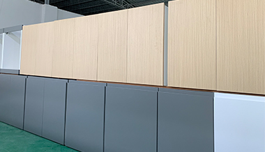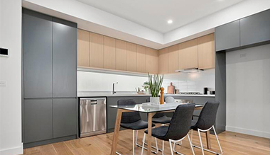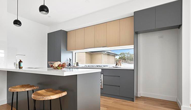 The door style of this project is very special. The matt finish grey lacquer doors with wood grain doors makes the kitchen stands out from regular kitchen designs.