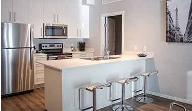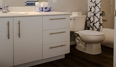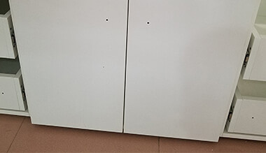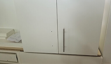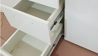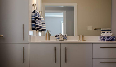 The kitchen & vanity cabinet doors are in durable melamine finish. Together with white countertop, the whole kitchen looks modern & concise.